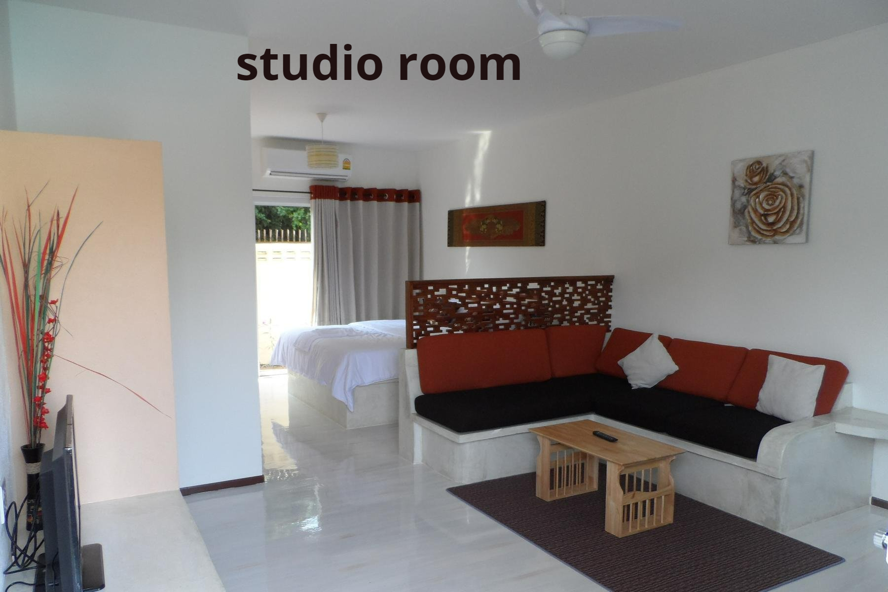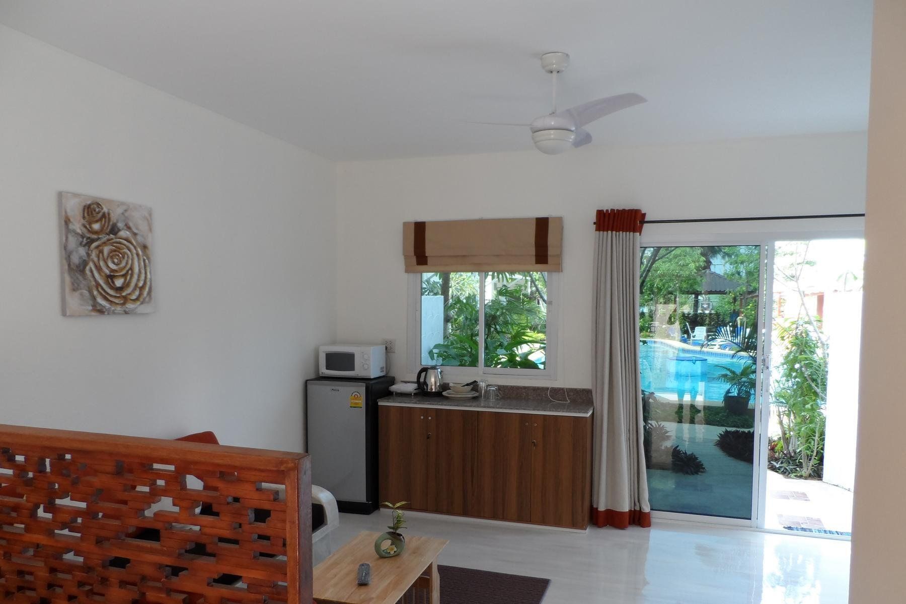 Studio room ground floor with kingsize bed . terrace . swimmingpool and garden view..