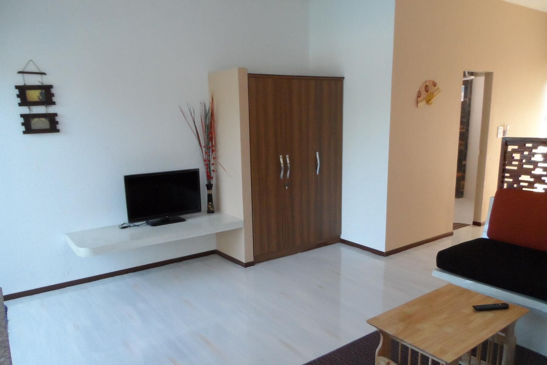 Ground floor one living room with single bed and one sleeping room with kingsize bed . swimmingpool and garden view..