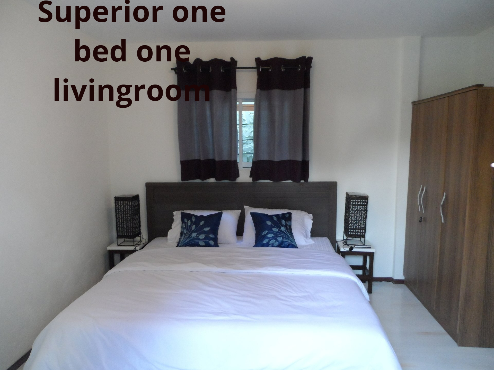 Ground floor one living room with single bed and one sleeping room with kingsize bed . swimmingpool and garden view..